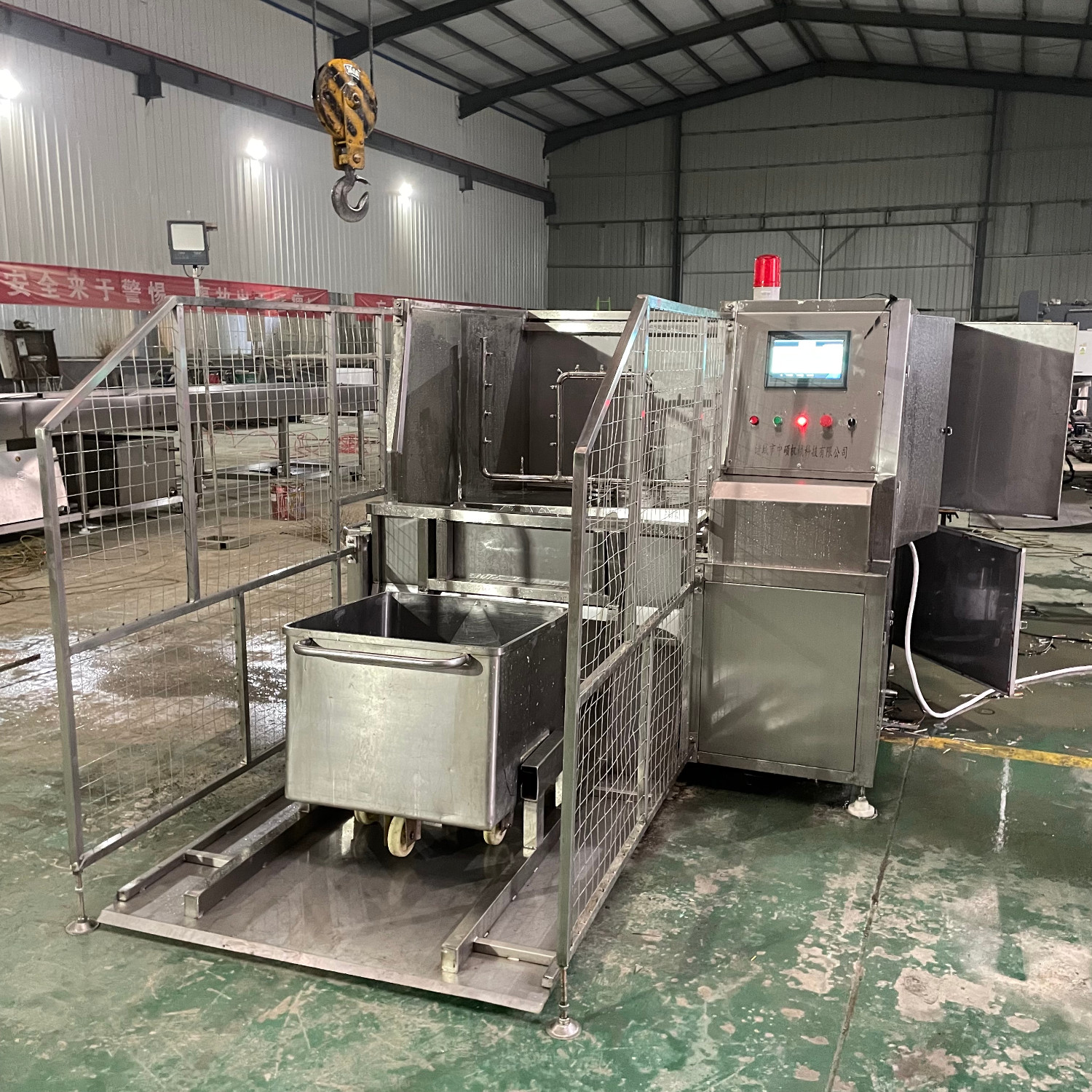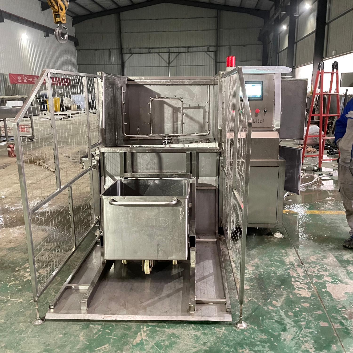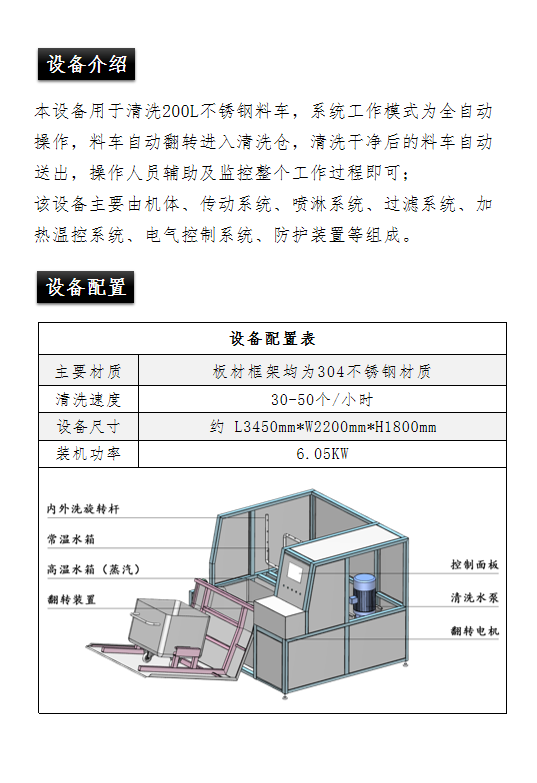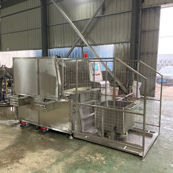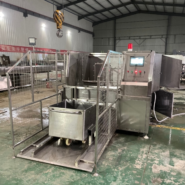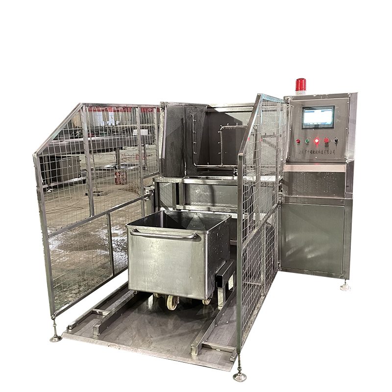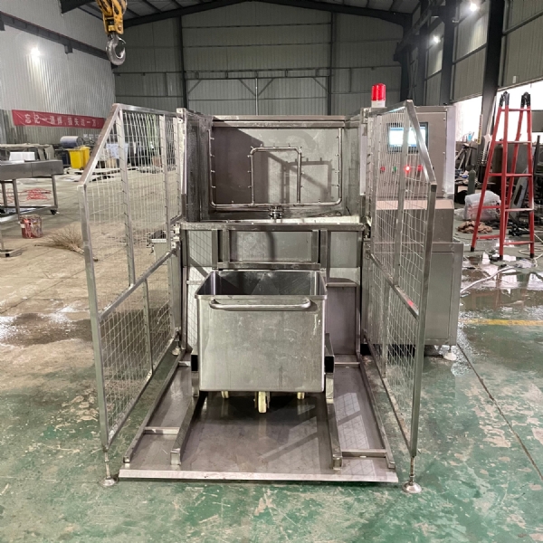 肉類食品生產(chǎn)企業(yè)中常用的工器具就是斗車(俗稱肉車),而容積為二百升的標(biāo)準(zhǔn)斗車的應(yīng)用又更為。斗車每周轉(zhuǎn)一次后均需進(jìn)行清洗消 毒。一直以來,斗車的清洗基本上都依賴人工,