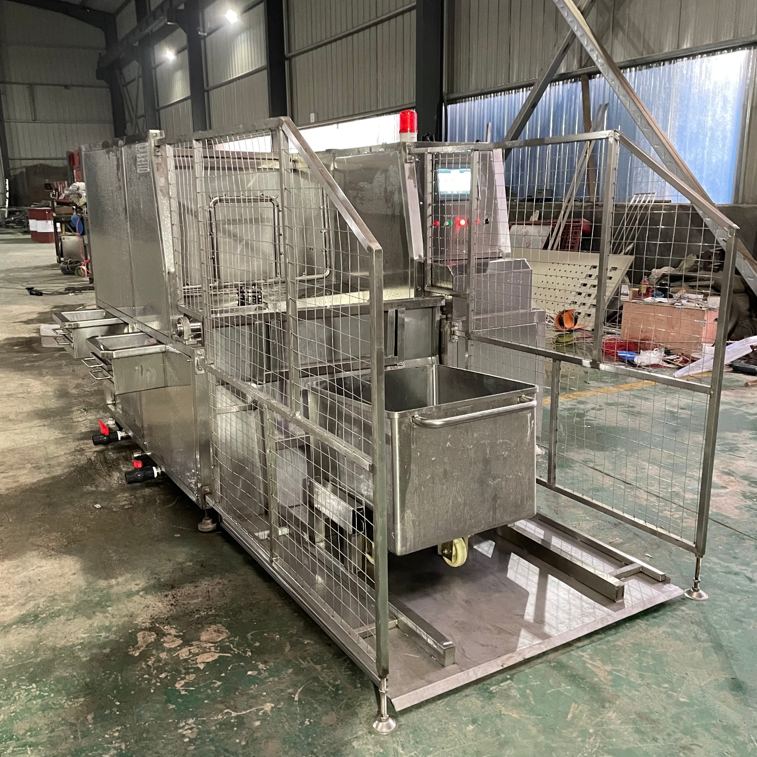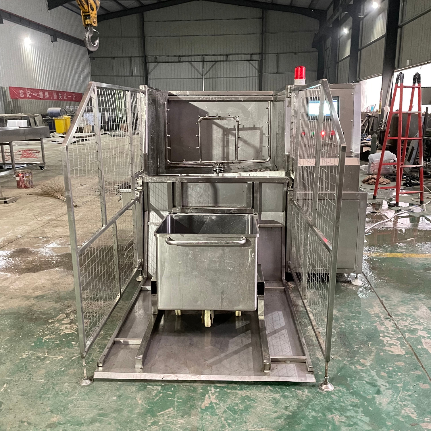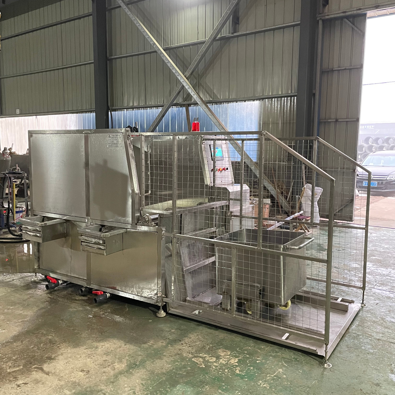 肉類食品生產(chǎn)企業(yè)中常用的工器具就是斗車(俗稱肉車),而容積為二百升的標(biāo)準(zhǔn)斗車的應(yīng)用又更為。斗車每周轉(zhuǎn)一次后均需進(jìn)行清洗消 毒。一直以來,斗車的清洗基本上都依賴人工,